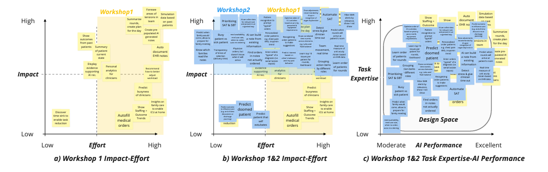 While both workshops facilitated ideation, the outcomes were different. Only the second workshop yielded high-impact concepts that were low-effort to build (that is, didn’t require near-perfect model accuracy). There was also a greater breadth of ideas relative to the other workshop. Output ideas included AI improving the coordination between clinicians (e.g., generating a schedule for nurses and respiratory therapists for extubation), or systems that improved logistics and resource allocation (e.g., predicting which medications would be needed based on current patients, and pre-ordering from the pharmacy).