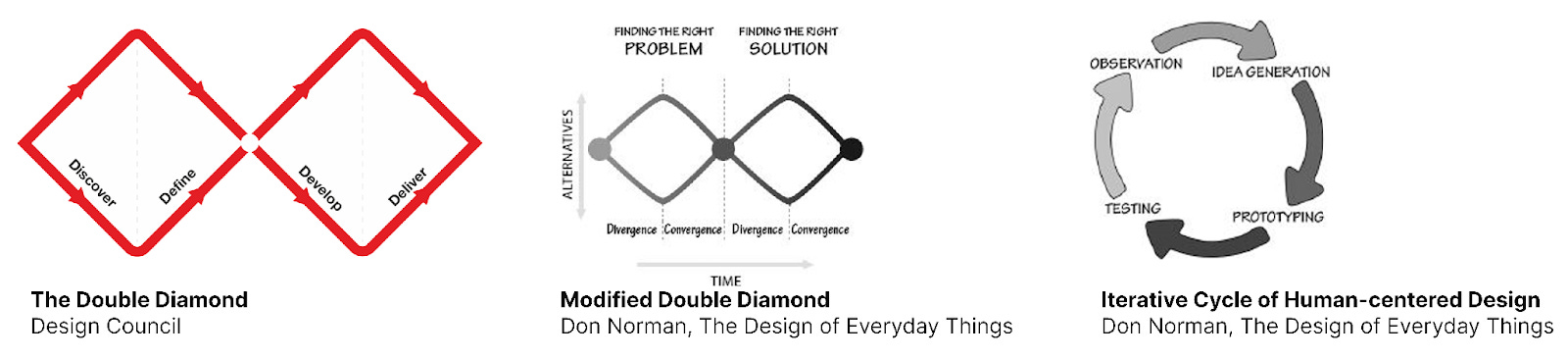 Whether it’s the original or Design-of-Everyday-Things version of the Double Diamond, or the iterative cycle of human-centered design, we fail to acknowledge that in practice, a solution may already be in mind (or in development) at project outset. In the case of gen AI, this strict separation of problem and solution space is especially unhelpful. For example, the capabilities of a large language model (LLM) - aka the solution - are often known early on in a project. Realistically, you’re not starting from a blank slate, where you conduct needfinding, diverge and converge, and the idea to build an LLM results from the subsequent ideation process. More likely, problem and solution space are coexisting and informing each other much earlier on.