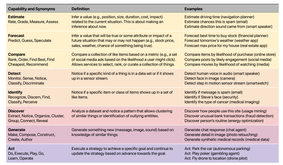 This approach of examining problems that we can solve for people by employing AI is supported by recent human-computer interaction research from Carnegie Mellon University. Researchers set out with a goal of improving the process of envisioning AI products and services through more effective ideation. They hypothesized that this would reduce the risk of producing AI innovations that cannot be built or that do not address real human needs. They began by collecting AI examples and capabilities, synthesizing these down to a shortlist of capabilities, synonyms, definitions and examples.