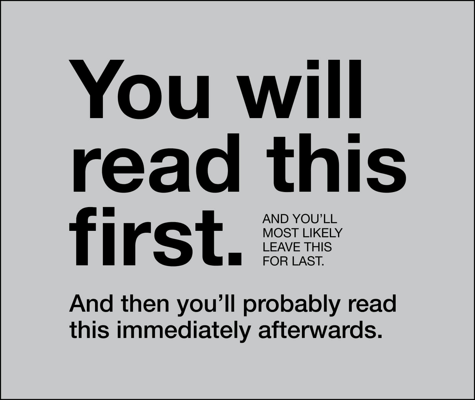 “You will read this first” is grabbing the user’s spotlight of attention, and should be in service of helping the user do what they need to do in your design solution to meet their needs. We need the “abstract” user needs foundation to successfully implement this visual design principle, and periodically zoom out from tactical work to make sure the layers of UX are interacting as intended.