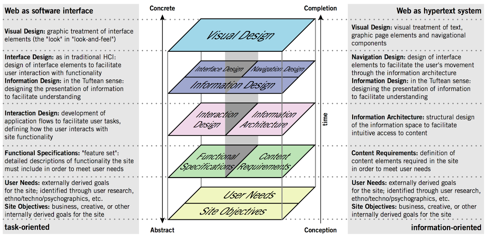 Jesse James Garrett’s seminal Elements of UX describes the five elements that comprise UX design, from the abstract to the concrete: user needs, functional specifications, interaction design, interface design, visual design. Put another way, these elements are: strategy, scope, structure, skeleton, and surface.